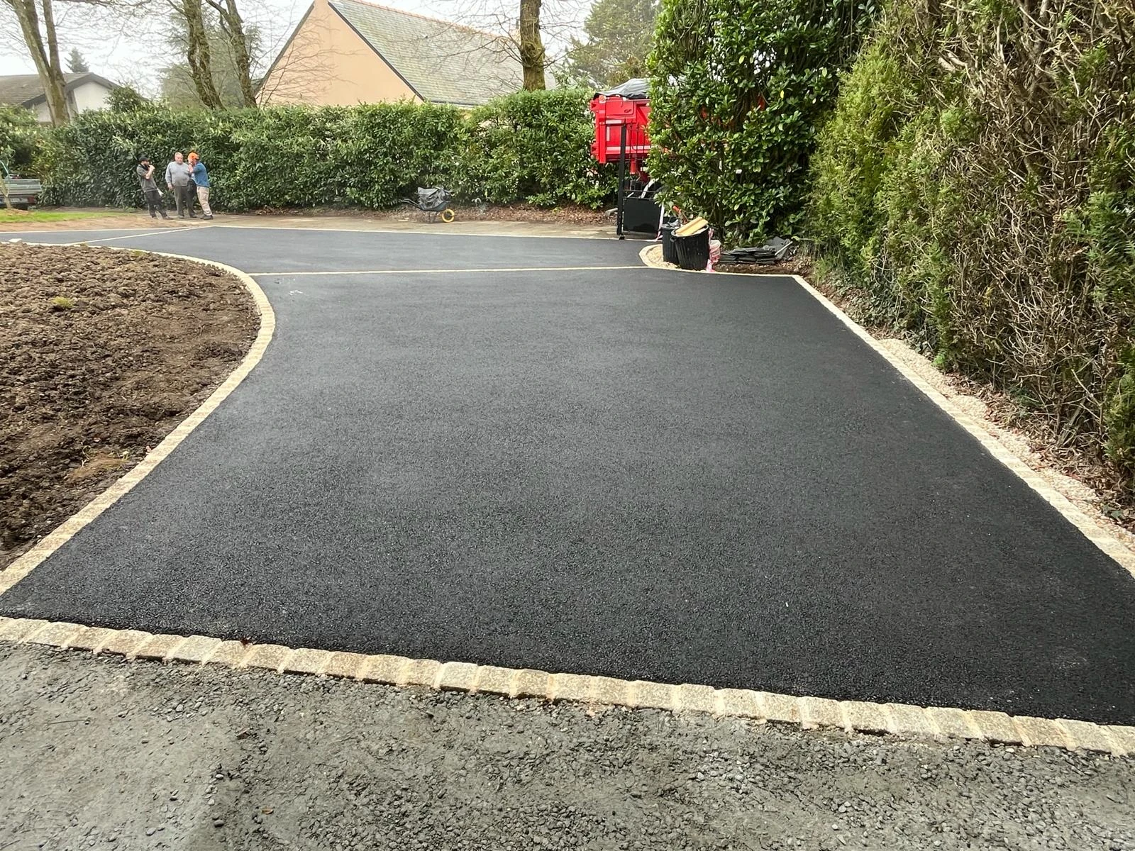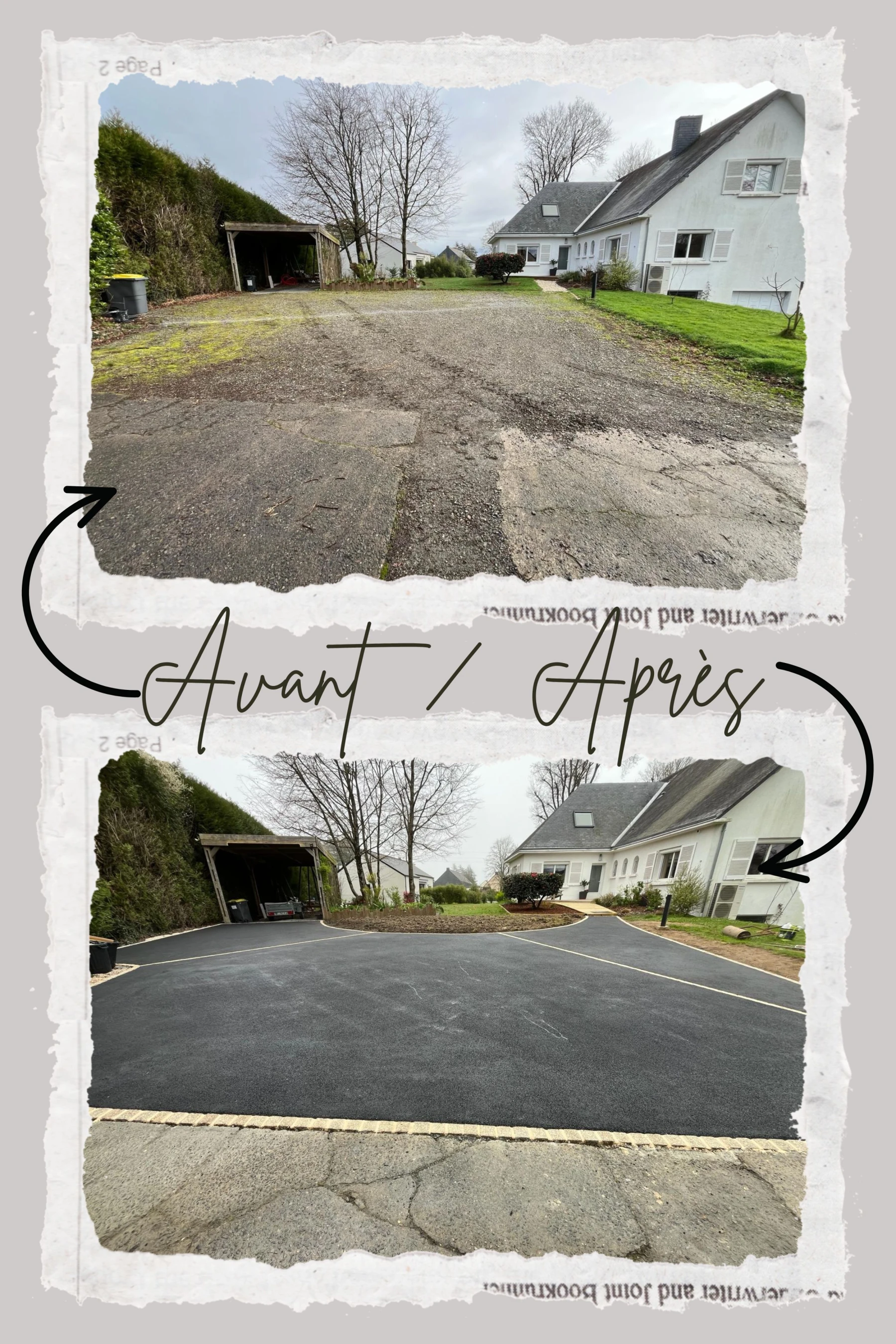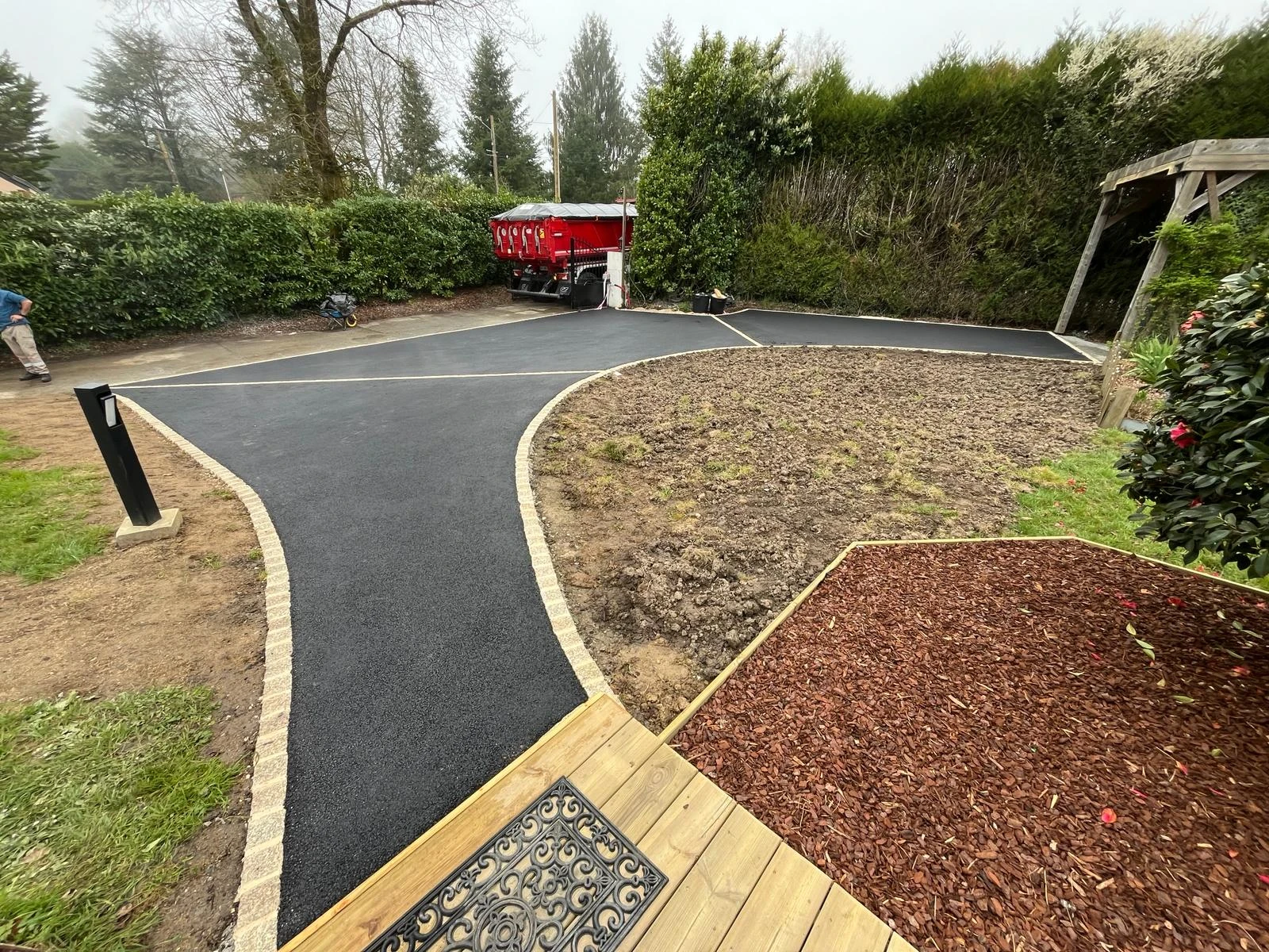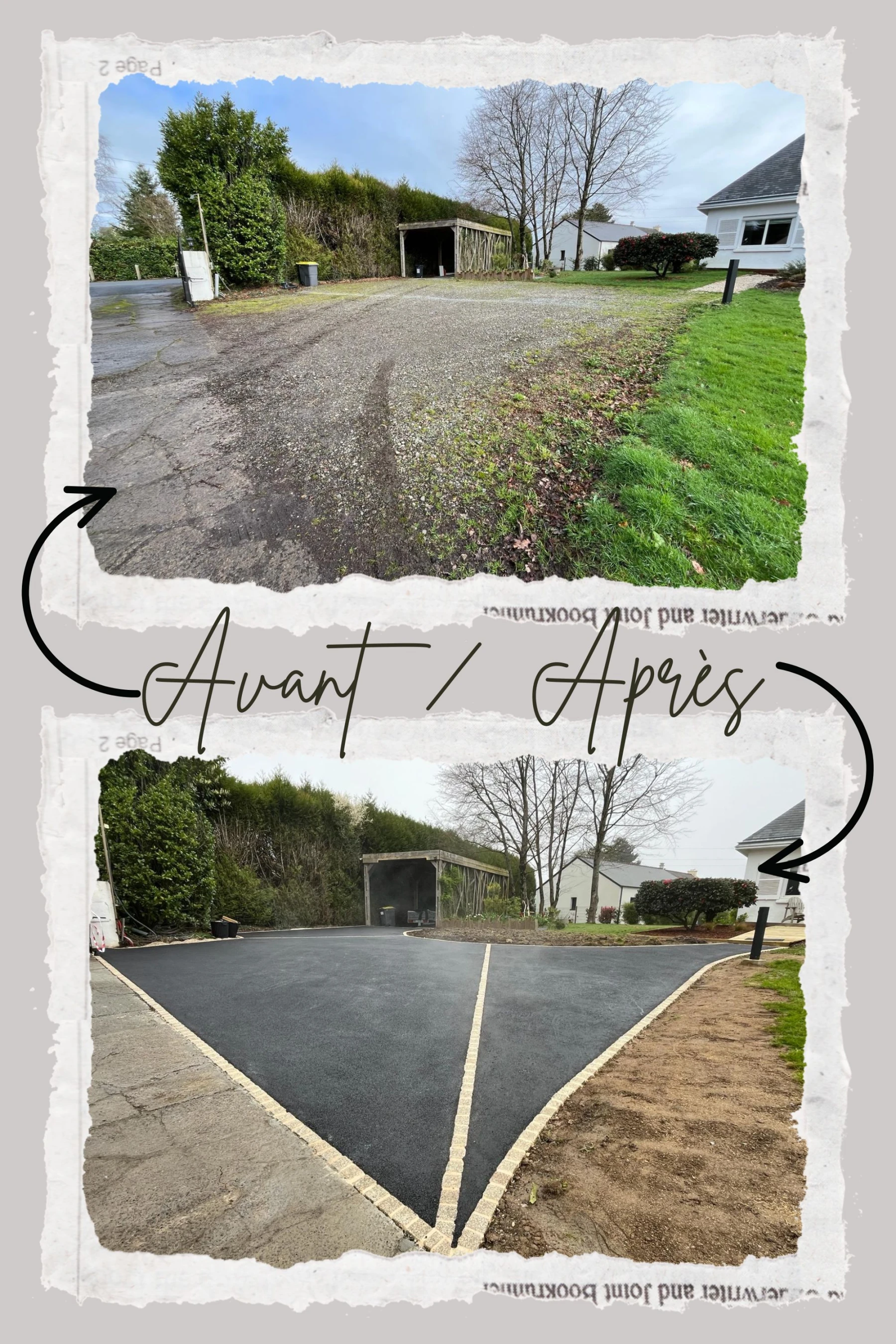 Aménagement d'une cour pour des clients sur TREILLIERES. Afin de casser la masse d'enrobé, vous pouvez opter pour des pavés.