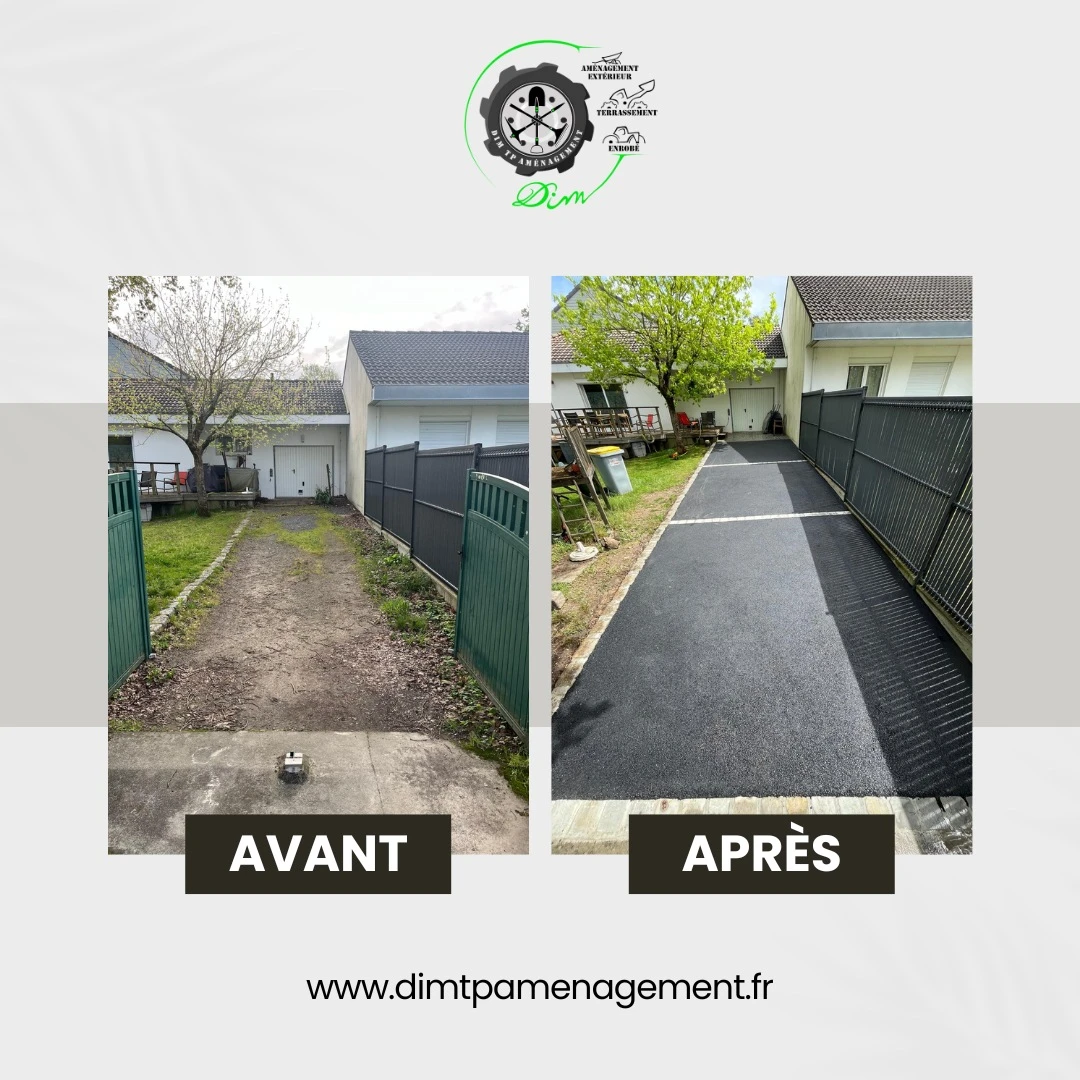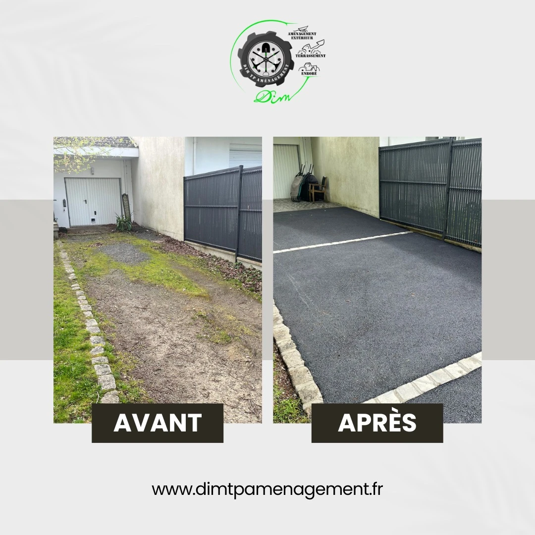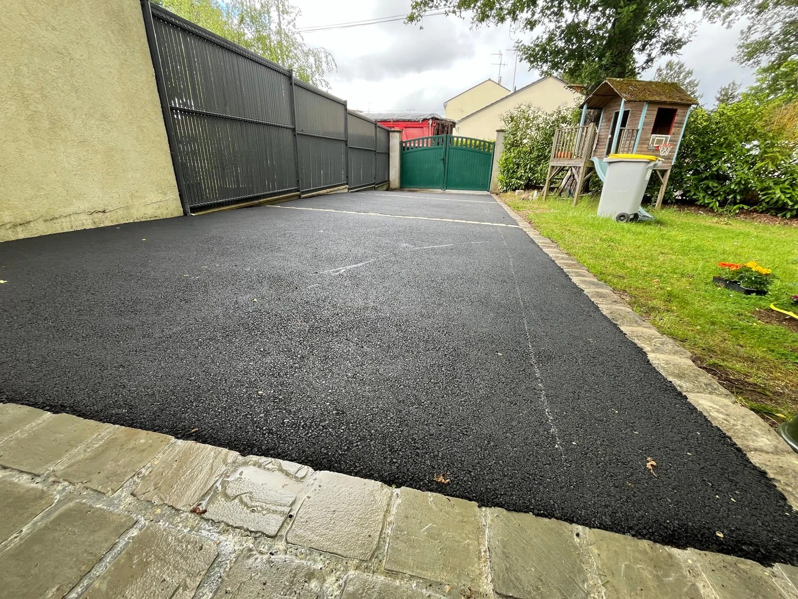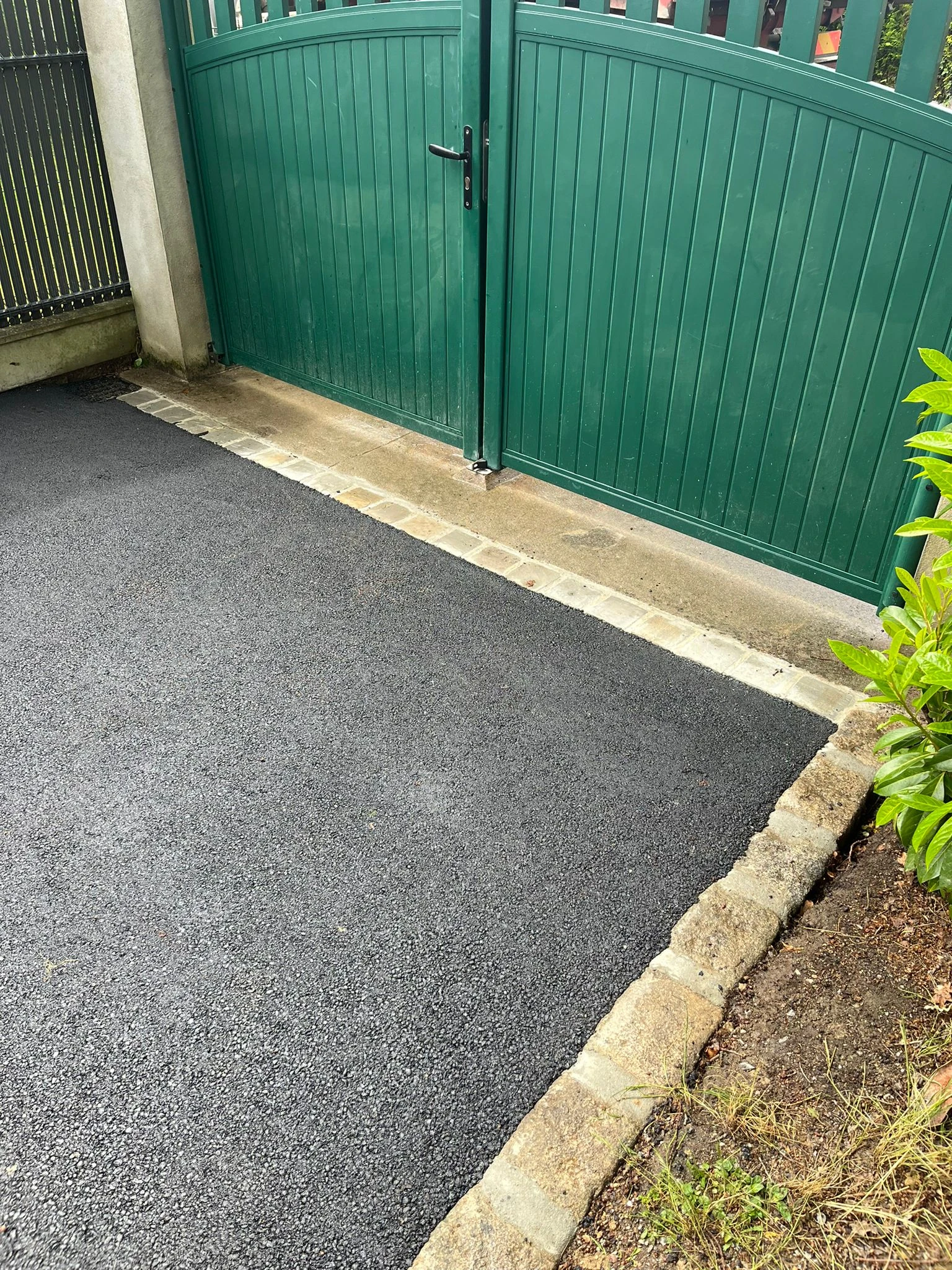 La transformation est juste incroyable ! Une grande allée en enrobé noir qui se termine par un beau pavage devant la porte du garage.